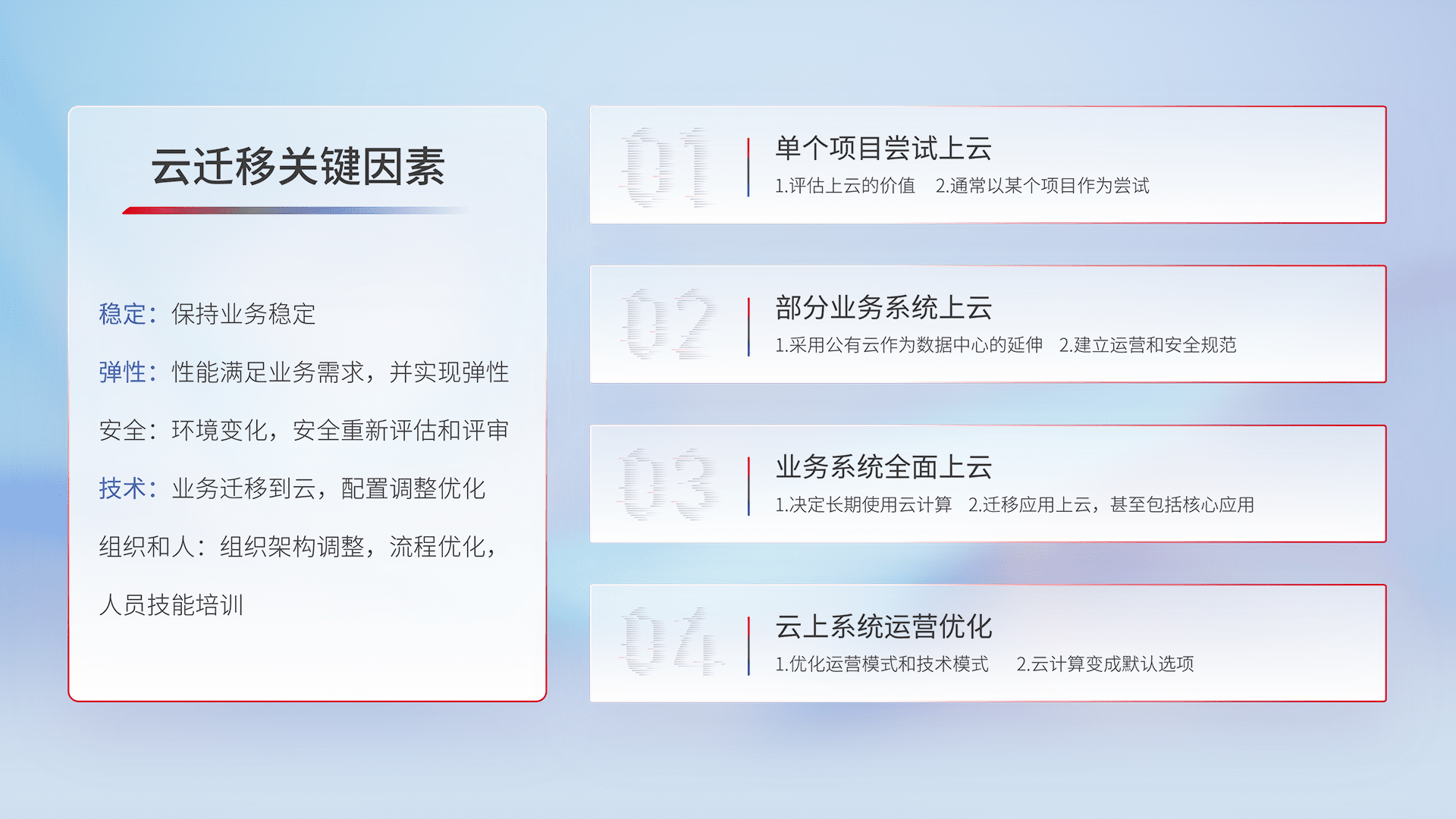 结合实际业务,,从规划设计、、云平台选型、、、、云原生改造、、数据迁移、、、、集成交付,,,迁移全过程为客户识别最佳上云路径,,,,做好风险识别管理,,,,设计网络架构、、、、身份权限、、、、安全审计合规、、、、操作审计、、、、日志审计、、、监控告警策略、、、多站点容灾设计等,,对云上基础设施进行整体规划,,,,提升IT治理水平,,,,以满足弹性、、高可用、、、高性能的需求。。。