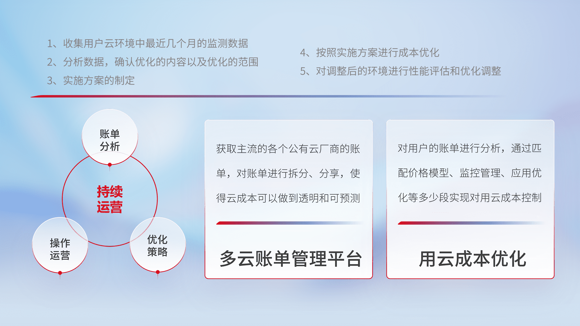 通过灵活运用多种自动化迁移工具,,,帮助企业用户实现业务和数据高效 、、稳定的上云迁移和云上迁移,,,,采用自研多云纳管平台,,,以中立管理模式,,,,解决多组织、、、多云、、多运维厂商的复杂关系的管理,,,,保证多云平台资源配置的一致性,,,,实时掌控云资源运行数据,,,,运用智能化工具分析云资源多云平台的管理服务,,,透明化管理成本支出,,,,用云成本可预测、、用云费用可优化、、、、云资源配额有据可依。。