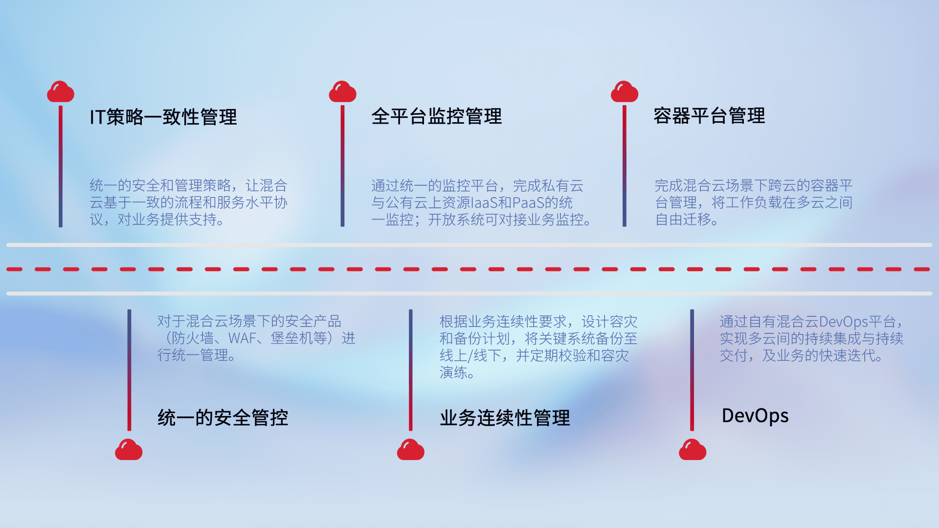 通过多云纳管,,,以统一的资源数据模型把客户的云资源进行抽象和封装,,,,进而实现对多云资源的统一操作,,,保障云资源管理的可靠性、、、、稳定性与可用性。。量身定制化运维内容,,,配置、、、开发运维、、、补丁管理、、、备份、、、、监控、、、、认证和访问管理、、、、审计和日常巡检等,,,,保障在用云过程中的可靠度,,,,稳定度以及高可用率。。
